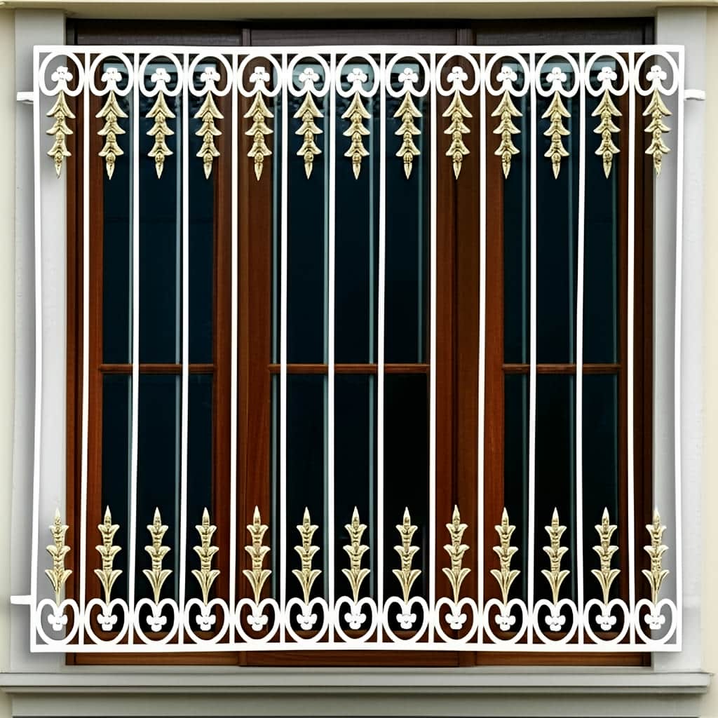 حفاظ پنجره مدل افشان در یزد از آهن فرفورژه مقاوم و فولاد کم کربن S355 ساخته می شود. میله های عمودی خمیده با فرم منحصر به فرد و فریم محکم, امنیت و دوام بی نظیری را برای نمای ساختمان در شهر یزد به ارمغان می آورند. جزئیات آبکاری شده طلایی و رنگ سفید کوره ای, این مدل را به یکی از لوکس ترین گزینه ها بدل ساخته است.